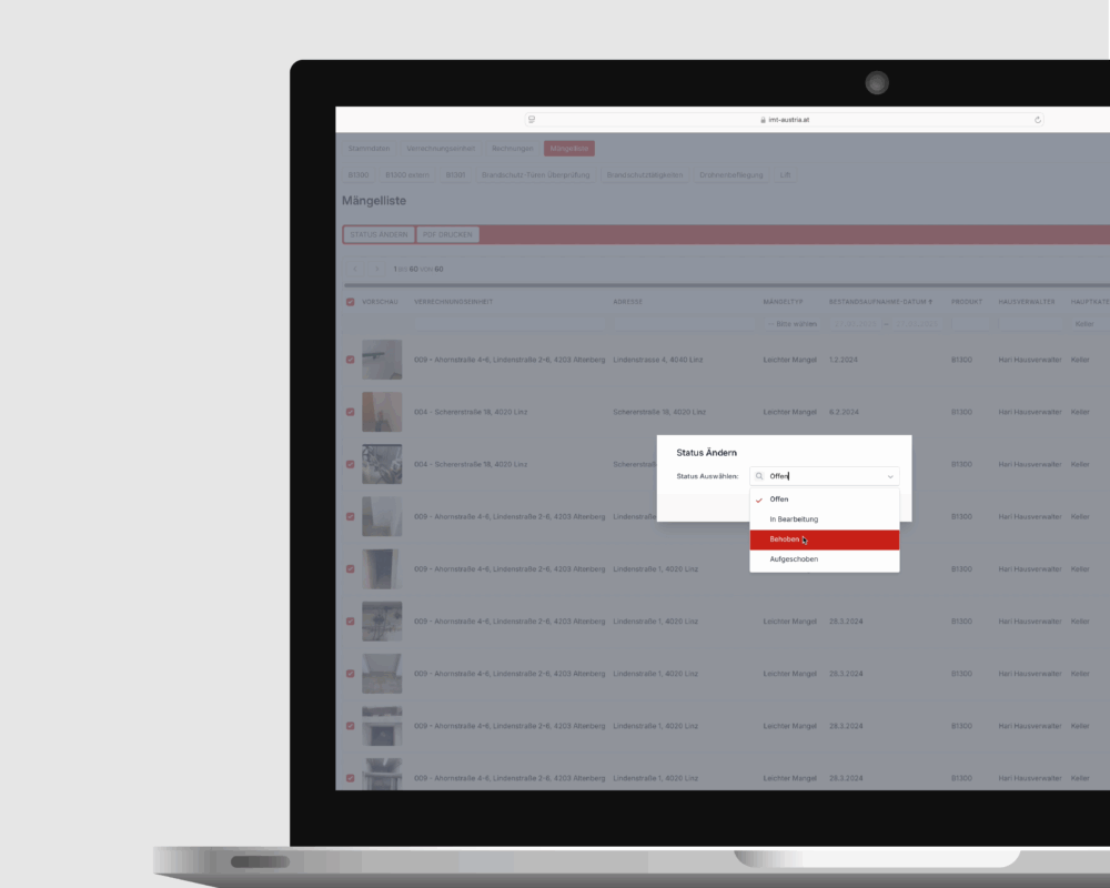 Ja. Die Mängelliste zeigt alle festgestellten Mängel aus den Gutachten. Sie kann nach verschiedenen, relevanten Kriterien gefiltert und bearbeitet werden. Alle im IMT aufgeführten Mängel können per Schnittstelle exportiert werden.